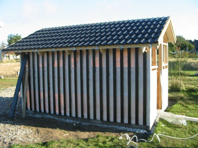 Her i november 2004 er vi begyndt at beklæde udhuset med - først - inderbrædder.